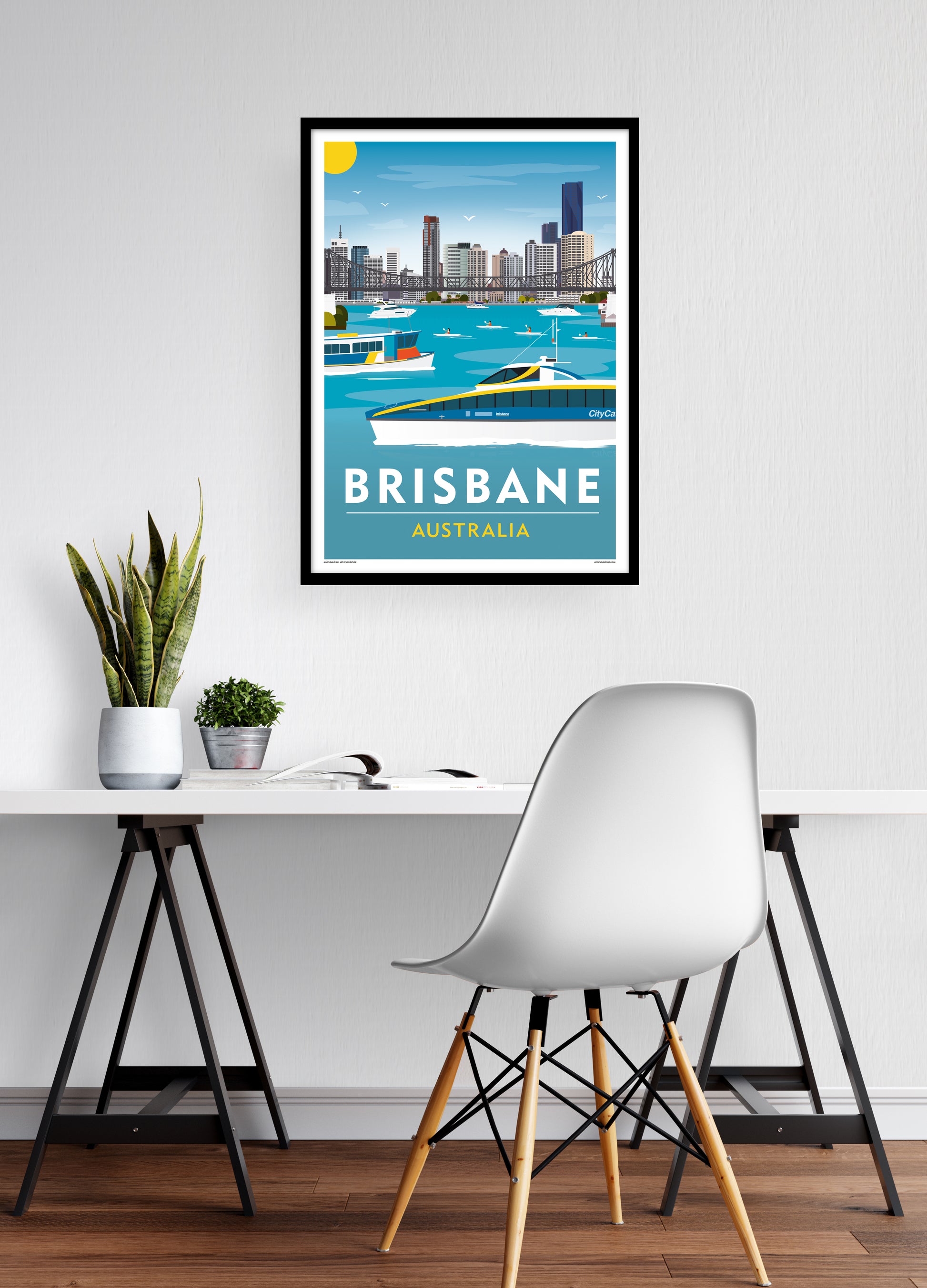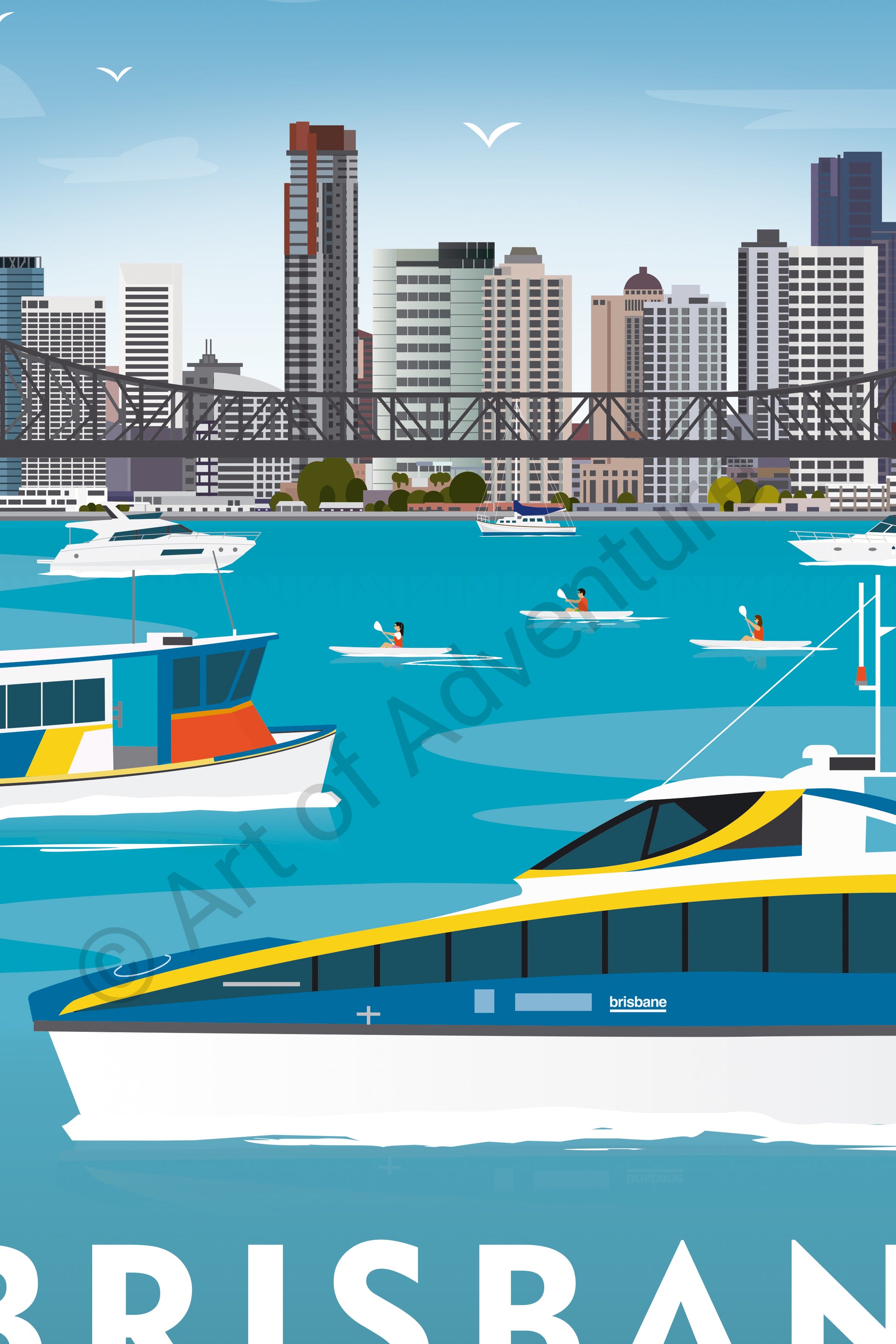 Brisbane, the capital of Queenland, is known for its sunny, tropical climate and laid back outdoor lifestyle captured in the design. Featuring the Brisbane River – the bustling waterway which spits the city into north and south with its CityCats, ferries, boats and kayakers enjoying the water.