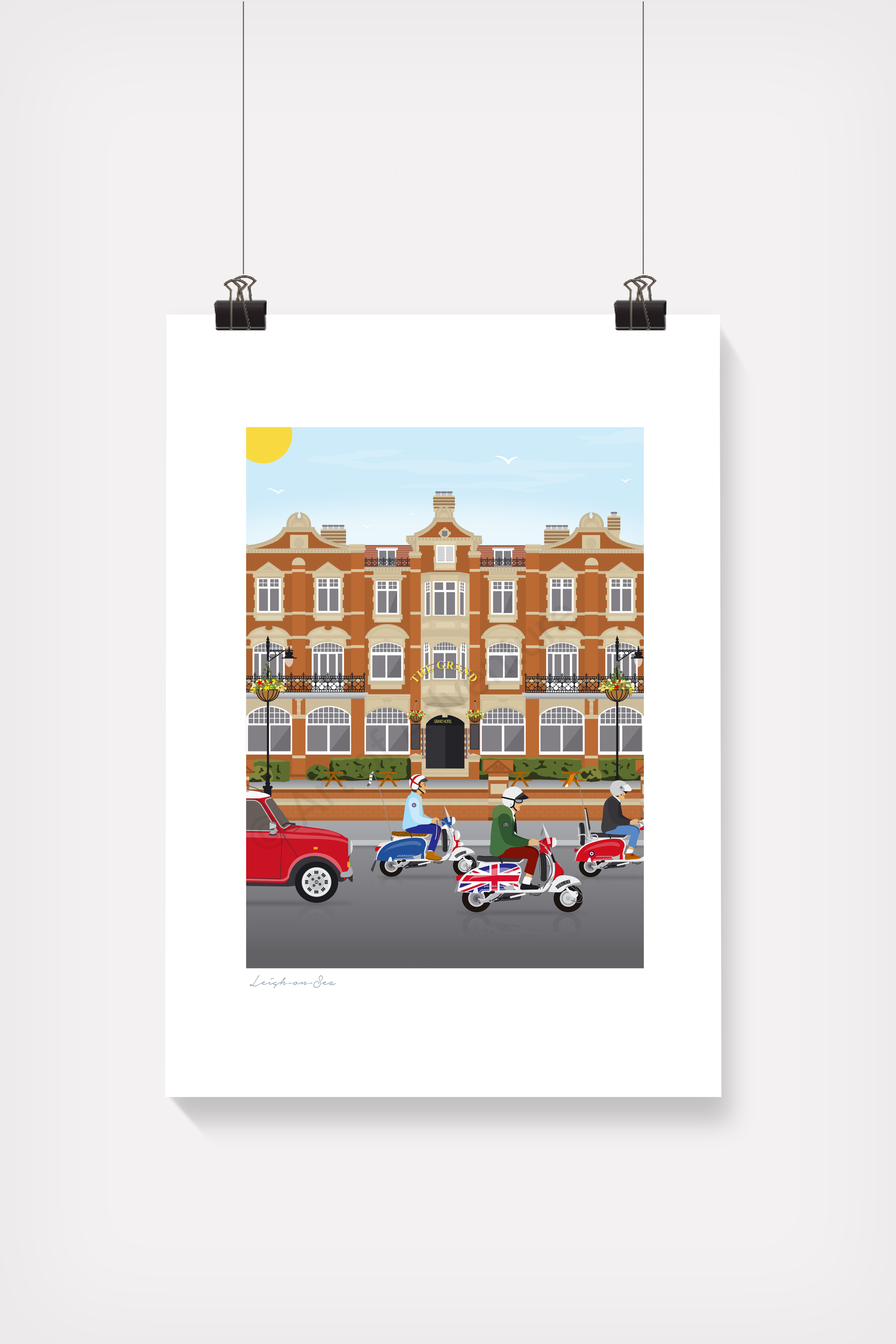 Leigh-on-Sea is located in Essex on the Thames Estuary. This design features The Grand, an iconic Leigh-on-Sea pub and hotel, situated on Leigh Broadway. Many locals will have happy memories of time spent in the Leigh institution. Lambretta scooters are driving past the pub on their way to Southend seafront.